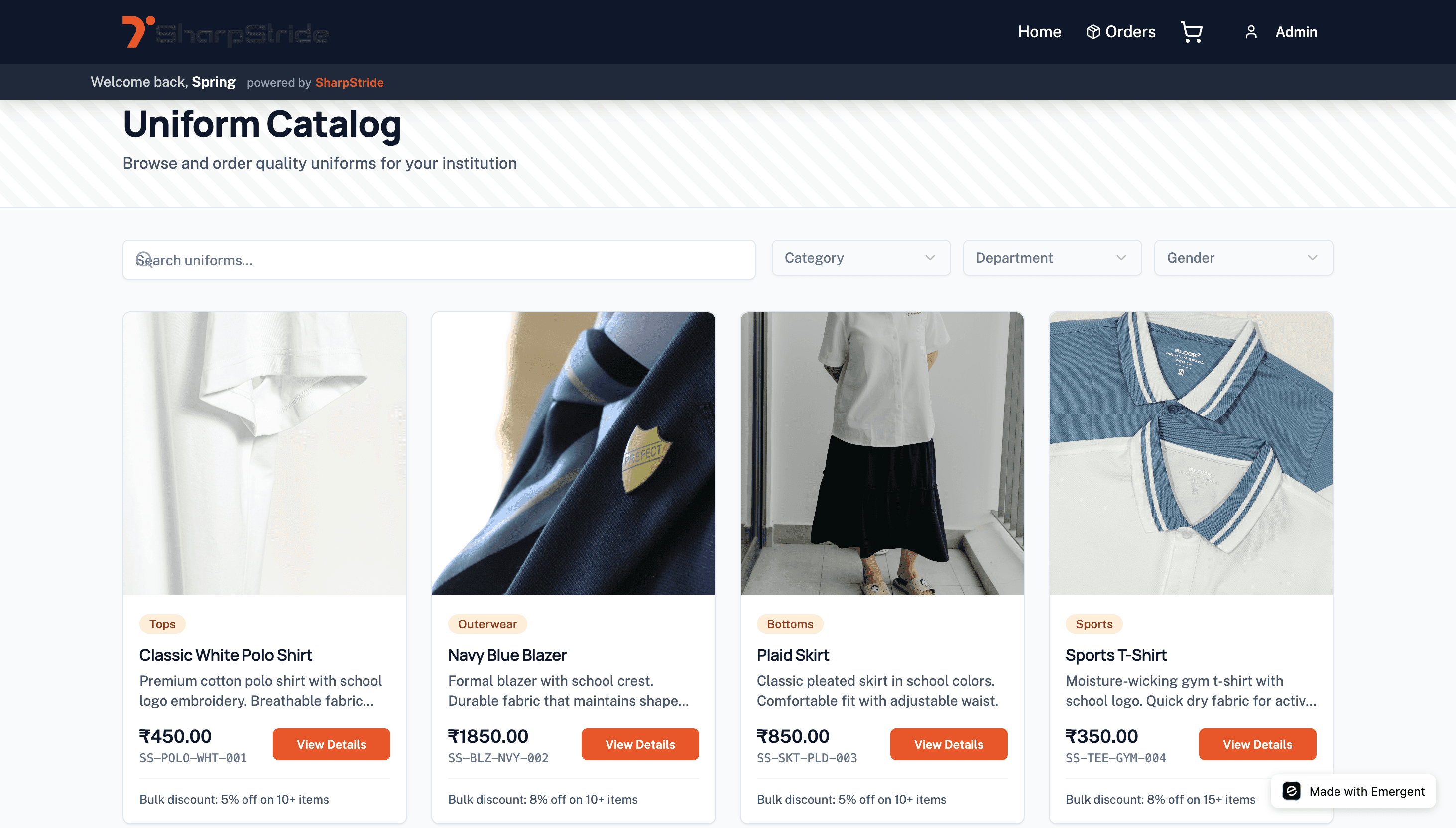 Once logged in, student/employee lands on their personal dashboard. Here, they can view available uniforms, order history, and updates.