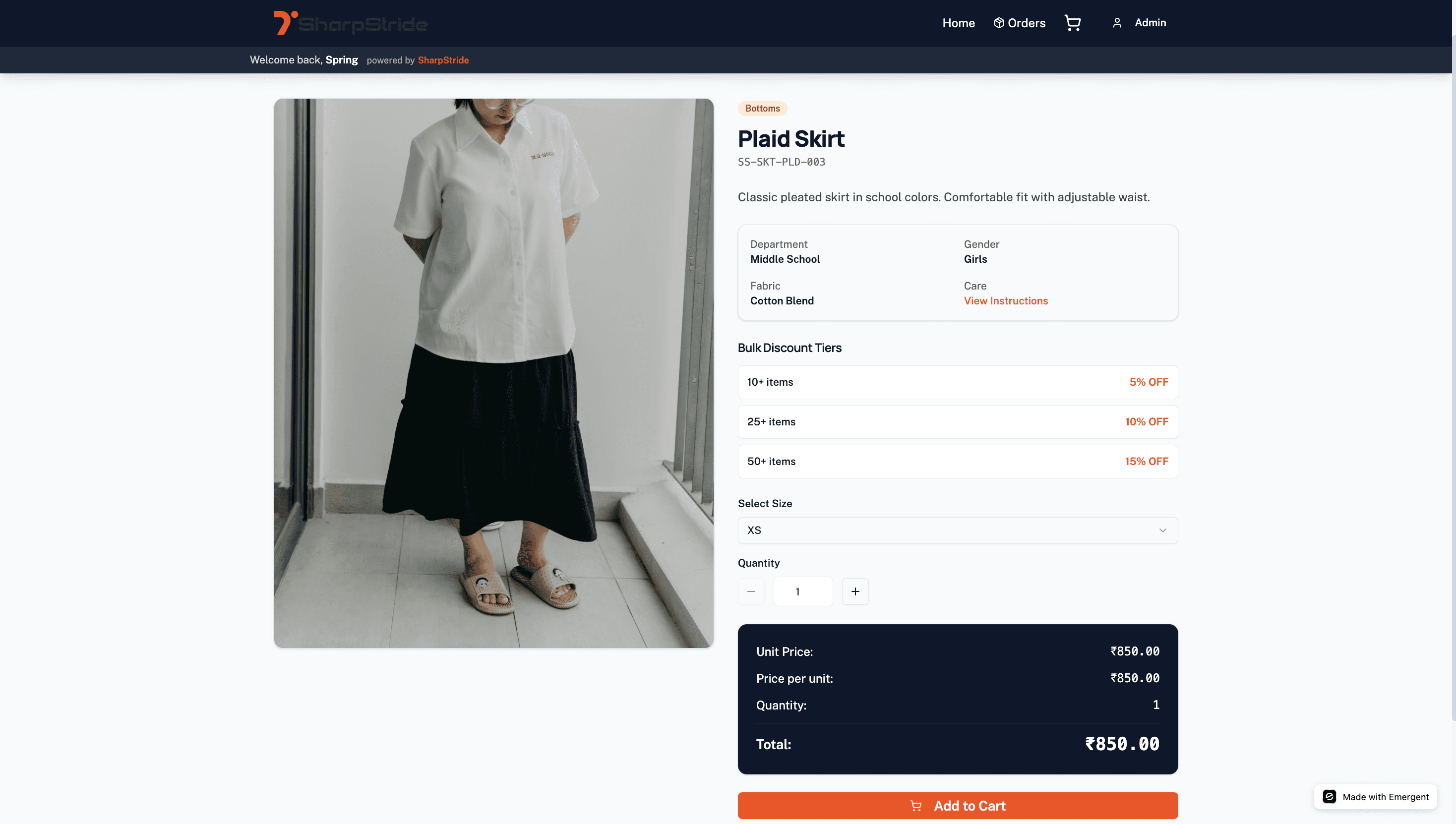 Browses through all approved uniform options in one place. Each item comes with clear images, details, and pricing. Selects size, fit, and any required custom options.